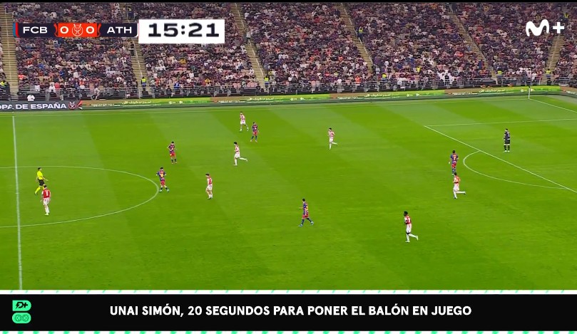 在本场比赛中,乌奈-西蒙在15分02秒的时候拿到皮球,但没有对方球员干扰的情况下,在15分22秒才将皮球放在地上并大脚开出,这段时间内裁判并没有表示。